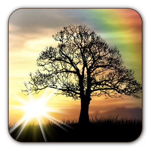 This live wallpaper features tree silhouette, on top of a morning sky background with soft cloud moving, birds flying, and rainbow appearing occasionally.